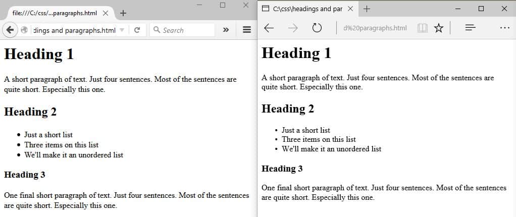 If we render that code in two different browsers we will see subtle differences. Here’s how Mozilla Firebox and Microsoft Edge render that code.
